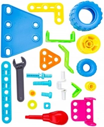 • 118 éléments : pièces de formes variées, roues, vis et écrous, tournevis et clé plate