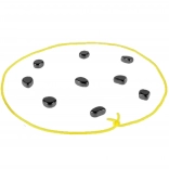 - Contenu : 20 cailloux magnétiques de formes variées, cordon jaune pour délimiter l’aire de jeu, sac en tissu, notice