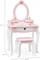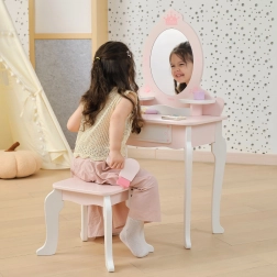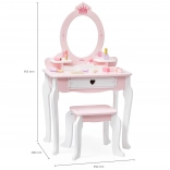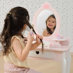 Cette coiffeuse rose‑blanc en bois de qualité offre aux enfants un espace sûr pour se maquiller et se coiffer de manière imaginative. Le miroir ovale avec motif couronne, les jolis détails en forme de cœur et le tabouret stable créent une atmosphère féerique dans la chambre.