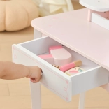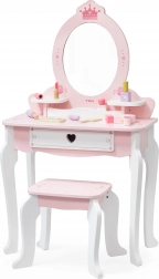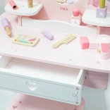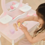 Le tiroir pratique et les petites étagères latérales accueillent tous les trésors. L’ensemble comprend un riche assortiment d’accessoires en bois : palette avec petit pinceau, rouge à lèvres, vernis à ongles, parfum, peigne, pinceau poudre doux et sèche‑cheveux. Le jouet présente des bords lisses et une surface traitée avec des peintures non toxiques pour jouer en toute sécurité.