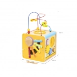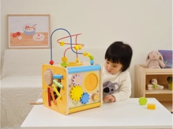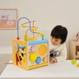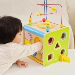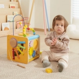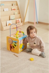 Découvrez l’univers des couleurs, des formes et des sons avec ce cube éducatif en bois 5-en-1. Il propose un labyrinthe à perles, un trieur de formes, des roues dentées, une horloge avec aiguilles mobiles et un panneau musical avec xylophone. Sa structure en bois stable, ses couleurs vives et ses détails bien pensés favorisent la motricité fine, la coordination œil-main, la pensée logique ainsi que la créativité des enfants dès environ 18 mois.