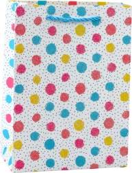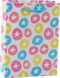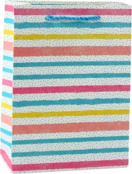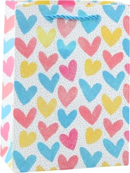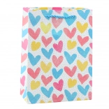Ce sac cadeau est fabriqué en carton décoratif résistant, garantissant sa durabilité et son aspect esthétique. Les motifs de cœurs colorés, d’étoiles, de pois et de rayures confèrent au sac un caractère léger et amusant, qui convient à de nombreux types de cadeaux. Les poignées en cordon assorties en couleur assurent un transport confortable.