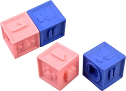 Lorsqu’on les presse, les cubes émettent un léger couinement, ce qui éveille la curiosité et développe l’audition. Le silicone souple est sûr pour les petites mains et les premières dents.