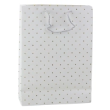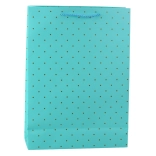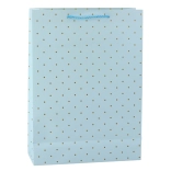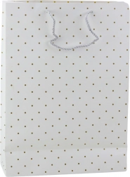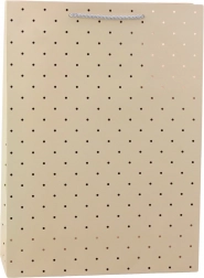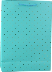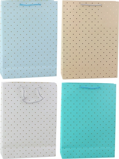 Ce sac cadeau stylé avec un motif délicat de points dorés est la solution idéale pour ceux qui privilégient la classique, la simplicité et l'élégance. Grâce à son design universel et délicat, il est un excellent choix autant pour les occasions formelles que personnelles. Le sac est disponible en quatre teintes pastel et sobres – bleu clair, beige, blanc et turquoise – qui s'adaptent facilement à l'occasion, au type de cadeau ou à la personne à qui il est destiné. L'impression dorée et brillante en forme de points ajoute un caractère noble et est un complément élégant au fond simple.