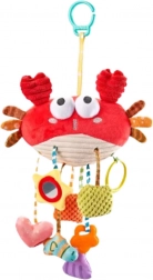 Le crabe comprend 9 fonctions en un produit, comme un hochet, un anneau dentaire, un sifflet, des pieds bruissants, un miroir avec effet miroir et plus. Le jouet peut être facilement attaché avec une pince universelle sur une poussette, un berceau, un siège auto ou un transat.