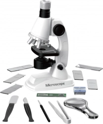 Le microscope est compact, ce qui le rend facile à ranger dans un sac à dos, un tiroir ou sur une table. Il fonctionne avec 5 piles AA (non incluses), ce qui permet de l'utiliser sans prise électrique - idéal pour une utilisation à la maison et en voyage. Le kit comprend une variété d'accessoires, tels que des lames, une pipette, une pince à épiler, une loupe ou des récipients de laboratoire, permettant la préparation et l'examen des échantillons - comme dans un véritable laboratoire.