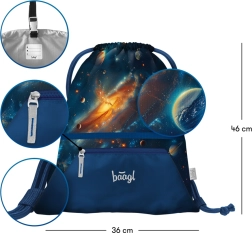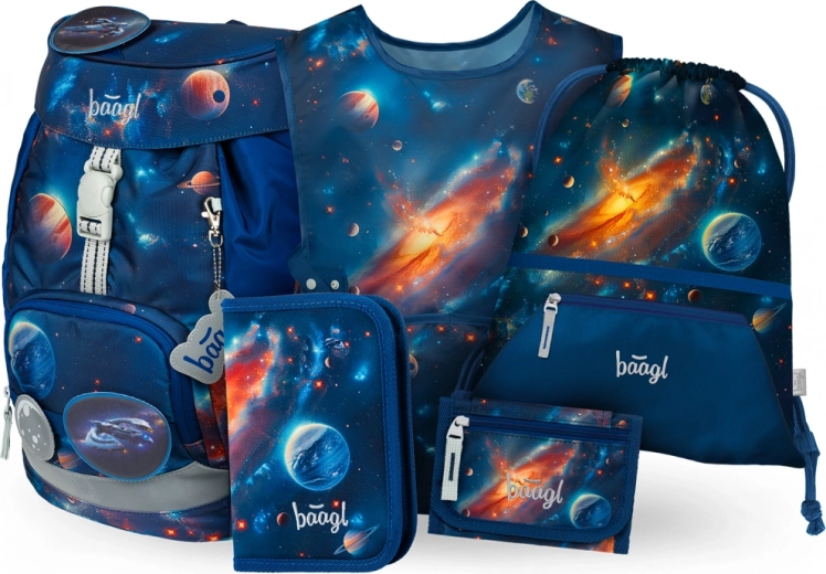 Préparez-vous pour l'école avec le ensemble complet de fournitures scolaires à motif cosmique. Cet ensemble comprend un sac à dos, une trousse, un sac pour chaussures, un tablier d'art et un porte-monnaie pratique, tout avec des motifs de planètes et galaxies sur fond bleu.