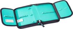 Après ouverture, la trousse se déplie complètement, ce qui facilite son organisation et la recherche des outils nécessaires. Les élastiques solides sont adaptés au rangement de crayons et feutres triangulaires. La trousse est respectueuse de l'environnement car elle est fabriquée à partir de matériaux recyclés.