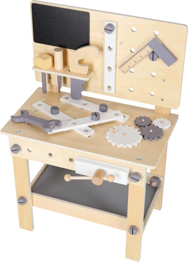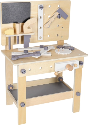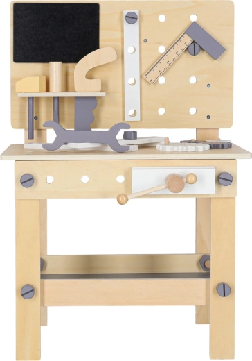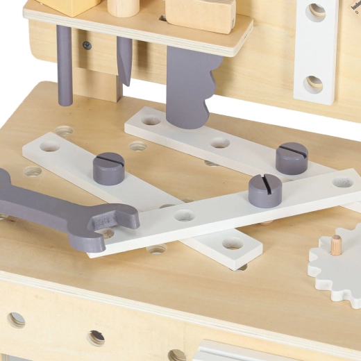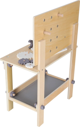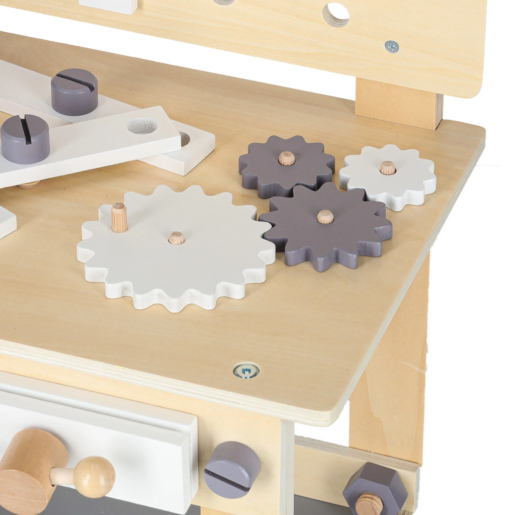L’établi d’atelier en bois est idéal pour les enfants qui aiment réparer et construire. Grâce au riche assortiment d’outils et d’accessoires, ils s’essaient au vissage, martelage, mesure et rotation d’engrenages. Sa conception stable aux couleurs neutres s’intègre parfaitement dans une chambre d’enfant.
