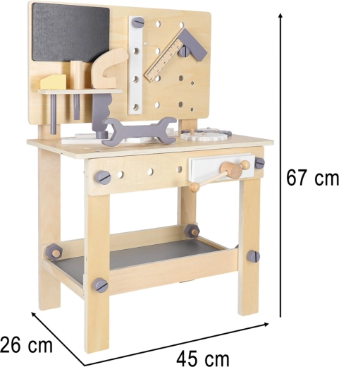 Un élégant établi en bois pour petits bricoleurs offre des heures de jeu créatif et d’apprentissage. Inclus: marteau, tournevis, clé, scie, réglette, vis, écrous, roues dentées et un étau fonctionnel. Sa structure robuste, étagère de rangement et panneau perforé favorisent l’ordre ainsi que le développement de la motricité fine et de la pensée logique.