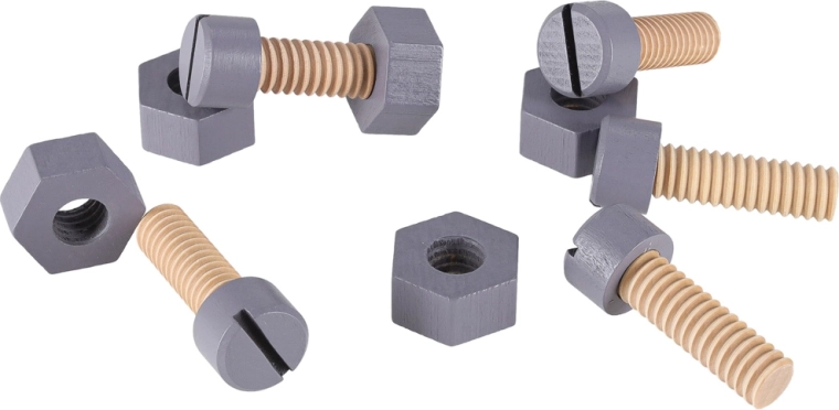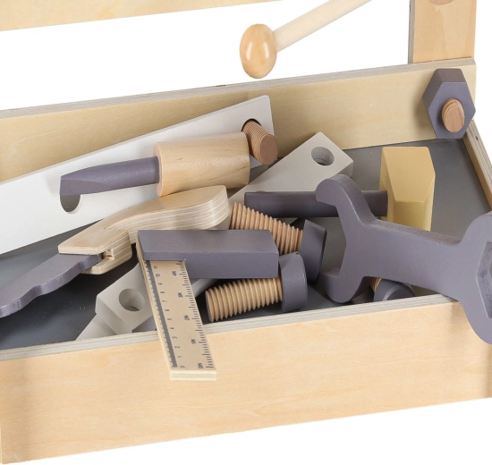 Scie, marteau, tournevis, clé à molette, réglette, vis et écrous – tout le nécessaire pour des assemblages créatifs et le développement de la motricité fine.