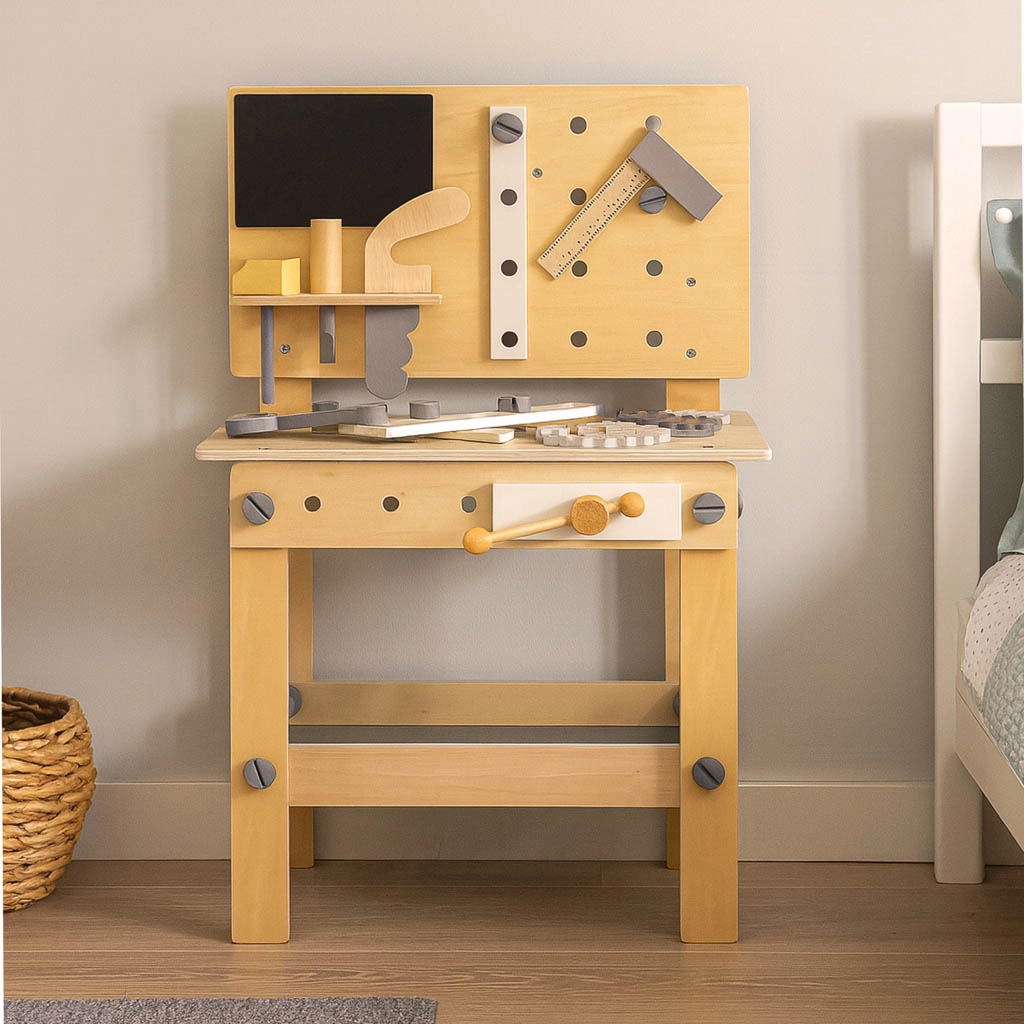 Le jeu d’imitation d’atelier développe la motricité fine, la coordination œil–main et la créativité. Le panneau perforé et le plateau de travail avec trous permettent d’infinies variantes d’assemblage et d’apprentissage des bases de la mécanique, tandis que l’étau ajoute un réalisme motivant.
