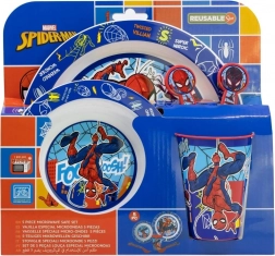 Ensemble de vaisselle pour enfants en cinq pièces avec le motif préféré SPIDERMAN de la marque STOR qui rend chaque repas plus agréable. Il comprend une assiette, un bol, un gobelet, une cuillère et une fourchette, est sans BPA et seul le gobelet est adapté au micro-ondes (max. 600 W pendant 2 minutes).