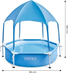 Voici la piscine pour enfants ronde à cadre INTEX avec protection solaire, idéale pour les chaudes journées d’été au jardin. Cette piscine est conçue pour offrir aux enfants un divertissement sans souci et des moments inoubliables !
