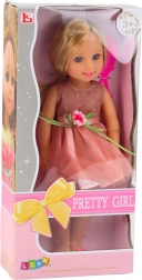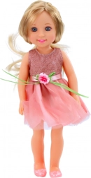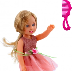 La poupée est vêtue d’une magnifique robe scintillante avec une jupe en tulle, ornée d’une délicate fleur et d’un ruban vert, soulignant son caractère féminin. Sa tenue est complétée par de petites chaussures roses parfaitement assorties à la robe. Les bras et les jambes articulés garantissent que la poupée n’est pas seulement visuellement attrayante, mais aussi très fonctionnelle pour le jeu – on peut librement la positionner, l’asseoir ou la faire « danser » dans des scènes imaginées.