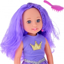 La poupée est vêtue d’une élégante robe violette avec un motif de couronne qui met en valeur son allure royale.