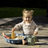 Ce mini bac à sable inclut tout le nécessaire pour un jeu amusant - arrosoir, râteau, pelle et deux moules à sable. Grâce à sa taille compacte, il est idéal non seulement pour votre jardin, mais convient également parfaitement pour le balcon ou la plage.
