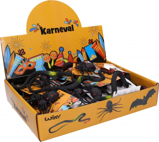 Un assortiment ludique de jouets en caoutchouc aux motifs serpent, chauve-souris et araignée dans un présentoir pratique. Le paquet contient 50 pièces de figurines souples et élastiques – idéal comme petites récompenses, pour les pochettes cadeaux et pour les décorations et jeux de Halloween.