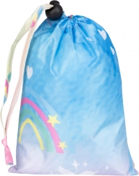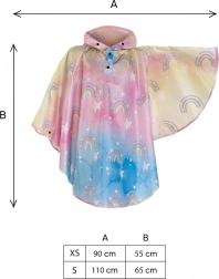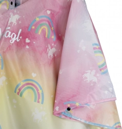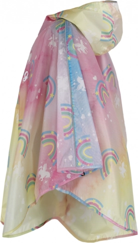 Poncho de pluie pour enfants stylé avec capuche à visière dans un design féerique de licornes et d’arc-en-ciel. Matière légère et imperméable, éléments réfléchissants pour la sécurité et coupe prévue pour être portée par-dessus un sac à dos ou un cartable font de ce poncho un choix idéal pour l’école comme pour les sorties. Inclus, un sachet à cordon pratique assorti au design.