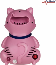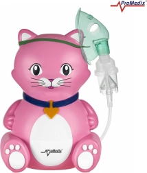 Adorable inhalateur pour enfants en forme de chaton de la marque PROMEDIX, un nébuliseur à compresseur conçu pour un fonctionnement en continu. Il offre une faible nuisance sonore, un pilotage simple par un seul bouton et un design sûr sans arêtes vives, idéal pour les petits patients comme pour toute la famille.