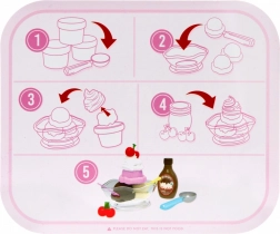 Il comprend un sable de modelage spécial pour former facilement des boules, une carte-recette pour apprendre étape par étape et un équipement riche d’accessoires pour une préparation de glace réaliste dans la cuisine des enfants.