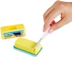 Un bloc de beurre réaliste sur son plateau avec couvercle et un couteau pour enfants aident à développer la motricité fine et à imiter la préparation des aliments.