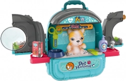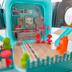 Le set comprend une figurine de médecin, des compagnons canins, du mobilier et l’équipement de la clinique ainsi que des instruments médicaux (stéthoscope, seringue, etc.), ainsi qu’un peigne, des ciseaux et d’autres accessoires de soin. L’ensemble est léger, compact et facile à transporter – idéal en voyage comme dans la chambre d’enfant.