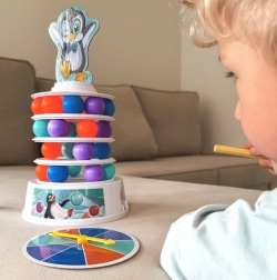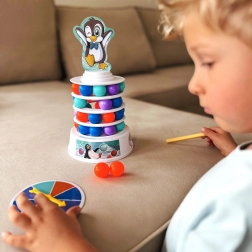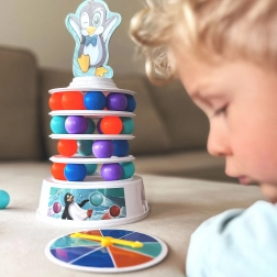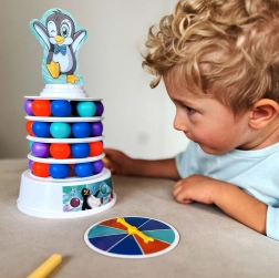 D'abord, assemblez la tour composée de billes colorées et de plates-formes glacées, couronnée par un joyeux pingouin. L'objectif est de placer les billes selon la couleur tirée au sort sans que la tour ne s'effondre et que le pingouin ne tombe. Celui qui fait tomber la tour perd.