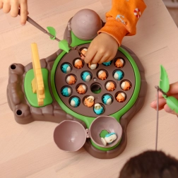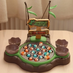 Partez à la pêche préhistorique avec un jeu qui captive immédiatement les enfants. La platine ronde tourne et les bouches de dinosaures s’ouvrent et se ferment rythmiquement — l’objectif est de les attraper au bon moment avec la canne magnétique. Le jeu favorise la patience, l’observation et la coopération entre enfants et adultes.
