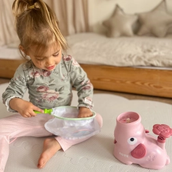 Un jeu d’adresse amusant pour toute la famille : un éléphant rose projette des disques et vous les attrapez avec un filet. Le jeu développe la déxtérité, la concentration et la coordination, est sécurisé et convient dès 3 ans. La force du tir se règle via la pression sur le bouton – plus vous appuyez fort, plus le disque vole haut et plus il y a de plaisir.