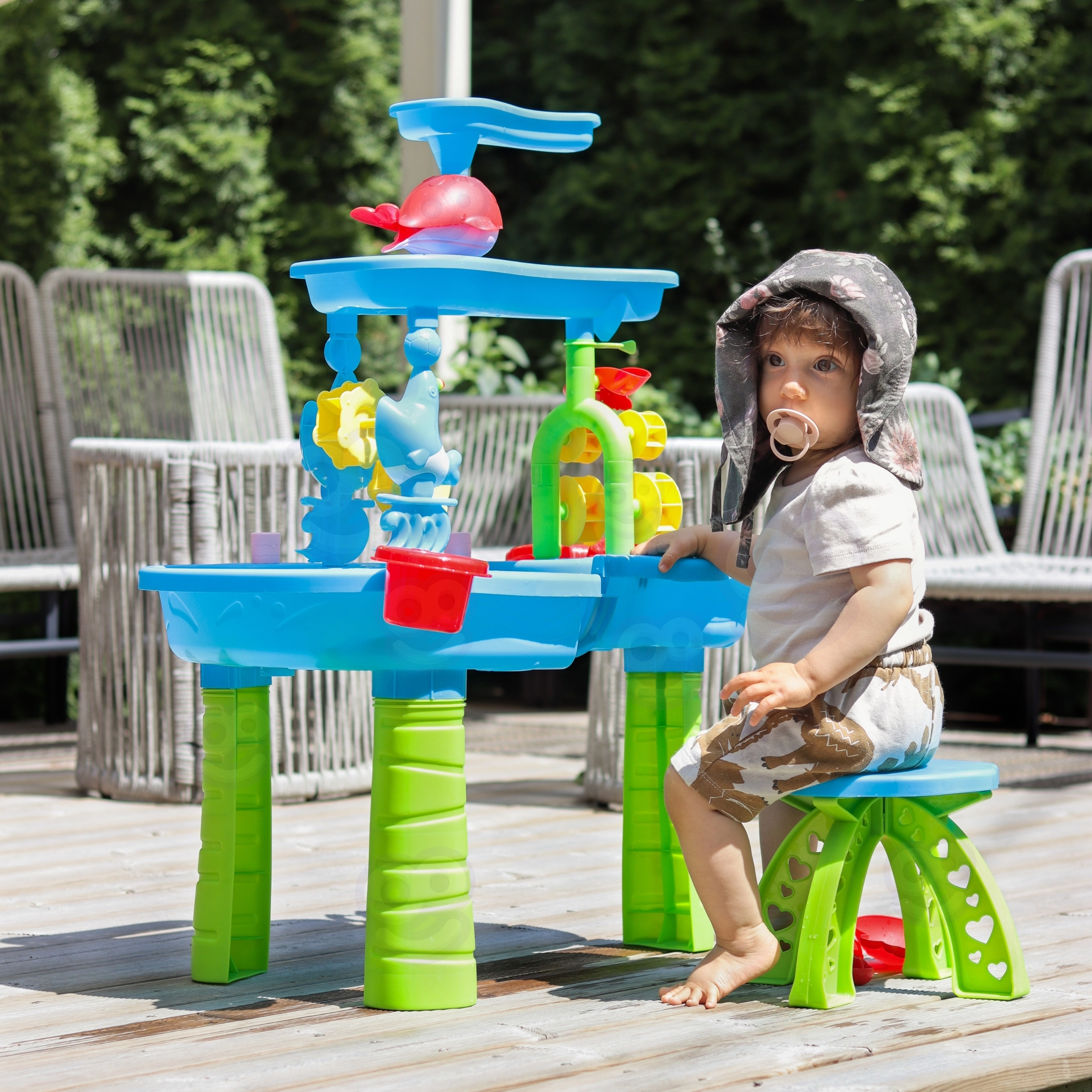 Découvrez l’univers ludique de la table d’eau et de sable WOOPIE, qui combine attractions aquatiques interactives et jeu créatif avec le sable. Versez l’eau dans le réservoir supérieur, observez la cascade s’écouler vers la cuve inférieure et faites tourner le moulin à eau. Grâce aux nombreux accessoires, les enfants peuvent puiser, tamiser, modeler et expérimenter avec le flux d’eau et le sable – un plaisir idéal au jardin, sur la terrasse ou dans la chambre d’enfant.