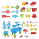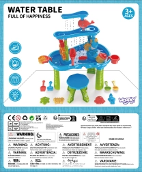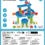Contenu de l’emballage : 2× seau, 1× arrosoir, 5× moule, 1× moulin simple, 5× outils pour le sable (p. ex. pelle, râteau, tamis), table eau/sable avec éléments de montage, 1× chaise.
