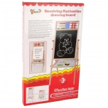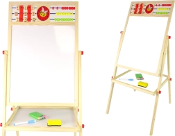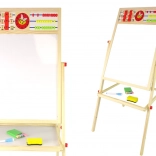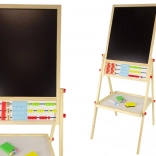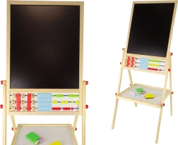 Le tableau double face en bois est un jouet éducatif idéal pour les enfants à partir de 3 ans. Sa structure stable sur pieds garantit un jeu en toute sécurité. La combinaison de deux surfaces, l’une à craie et l’autre magnétique, offre de nombreuses possibilités de jeu :