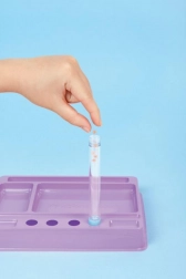 - 3 corps de stylos, capuchons, entonnoir, paillettes, icônes moulées, plateau de jeu/préparation, notice simple