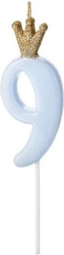 Bougie d’anniversaire bleue avec couronne, parfaite pour décorer un gâteau lors d’une fête d’anniversaire d’enfant.