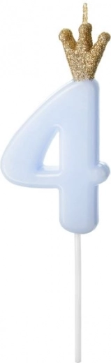 Ajoutez une touche parfaite à la fête avec cette bougie d’anniversaire en forme de chiffre 4, de couleur bleue et ornée d’une couronne.