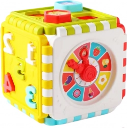 Le cube est rempli de diverses activités comme des horloges avec des aiguilles mobiles et un trieur de formes qui soutiennent l'apprentissage des enfants.