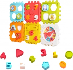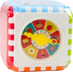 Chaque face du cube propose une tâche excitante : horloges, chiffres et formes avec des images pour stimuler les sens.