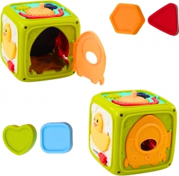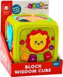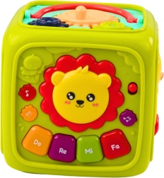 Le cube interactif comprend des éléments musicaux, tels que des touches avec des mélodies, ainsi qu’un lion amical qui encourage l’interaction. Vous y trouverez également des formes à trier, des portes mobiles, des éléments rotatifs et des illustrations joyeuses avec des animaux. Le jouet diffuse des sons et des chansons qui stimulent les sens et le développement de l’ouïe chez les plus petits.
