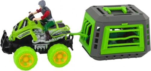 Le set comprend non seulement un quad robuste avec une cage amovible, mais aussi une figurine de conducteur avec casque de protection et une figurine de dinosaure, formant ensemble une scène cohérente prête à jouer dès le déballage.