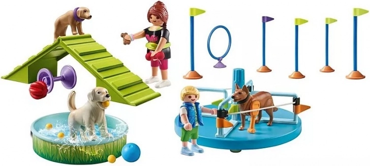 2 figurines d’enfants, plusieurs chiens, obstacles (cercle, slalom, balançoire/planche d’équilibre, rampes), accessoires