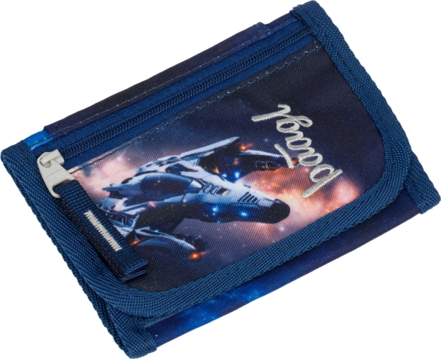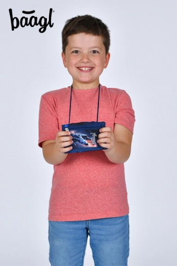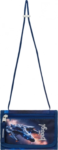 Pratique porte-monnaie pour enfants à porter autour du cou avec motif de vaisseau spatial de la marque BAAGL, offrant un port sûr, assez d’espace pour la petite monnaie et les cartes, et une conception résistante en matériaux recyclés. Grâce à son cordon ajustable avec sécurité et à sa fermeture par velcro, il est idéal au quotidien pour l’école et les activités.