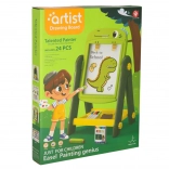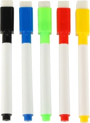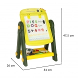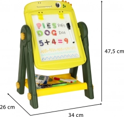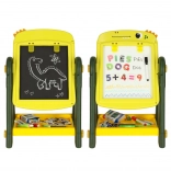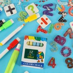 Inclus: diverses aides pédagogiques comme des lettres et chiffres magnétiques, des craies et des marqueurs.