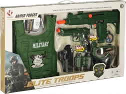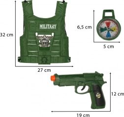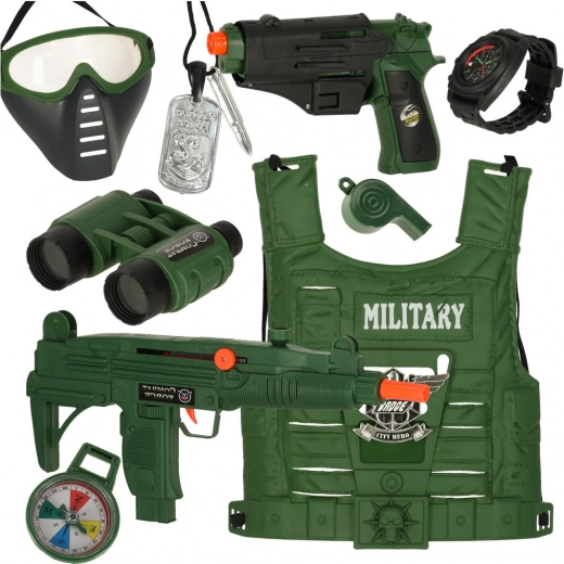 Ce set militaire est idéal pour tous les jeunes amateurs d'aventure et de jeux militaires. Grâce à cet ensemble, les enfants peuvent vivre des missions palpitantes et des aventures. Il comprend: un gilet, des jumelles, un fusil à rechargement mécanique, un pistolet à piles, une montre en silicone, un masque pour les yeux, une boussole, un véritable sifflet, une plaque d'identification militaire et un étui pour pistolet. Chaque élément est fabriqué avec des matériaux de qualité et offre des détails réalistes.