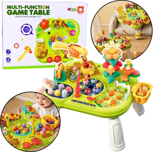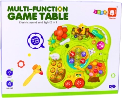 La table propose différentes fonctions qui stimulent la curiosité et encouragent l'expérimentation. Elle inclut des jeux comme « attrape la taupe », des boutons interactifs, des fleurs colorées, des éléments rotatifs, des leviers et des engrenages. Elle aide les enfants à comprendre la cause et l'effet, apprend des mouvements précis des doigts et des mains. Elle est donc non seulement une source de divertissement, mais aussi un soutien pour le développement cognitif et manuel naturel.