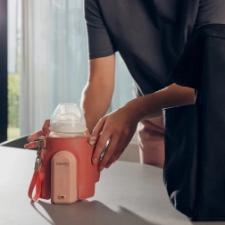 Vous pouvez recharger votre chauffe-biberon commodément à l'aide d'un connecteur USB-C depuis une prise électrique, une powerbank, ou même une voiture. Il dispose également d'une sangle pour un transport facile et peut être attaché à la poignée d'une poussette ou d'un sac. Le bouton de sécurité garantit que le chauffe-biberon démarre uniquement après l'insertion de la bouteille.
