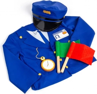- Contenu de l’emballage : veste bleue doublée, casquette, montre de poche, badge nominatif, 2 drapeaux de signalisation (rouge et vert)