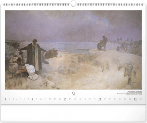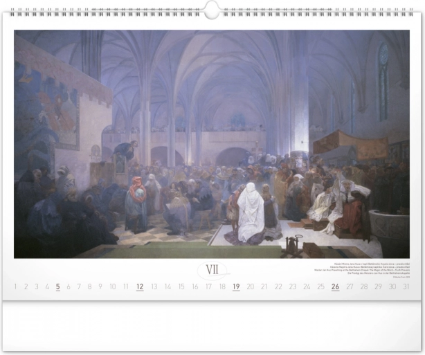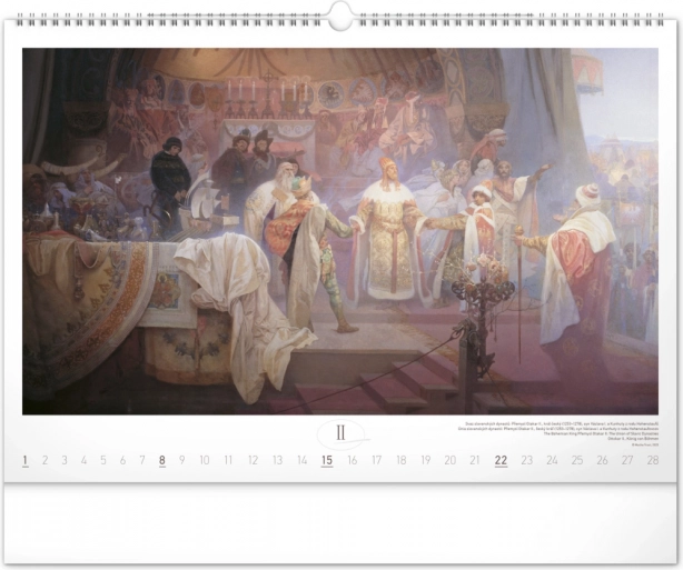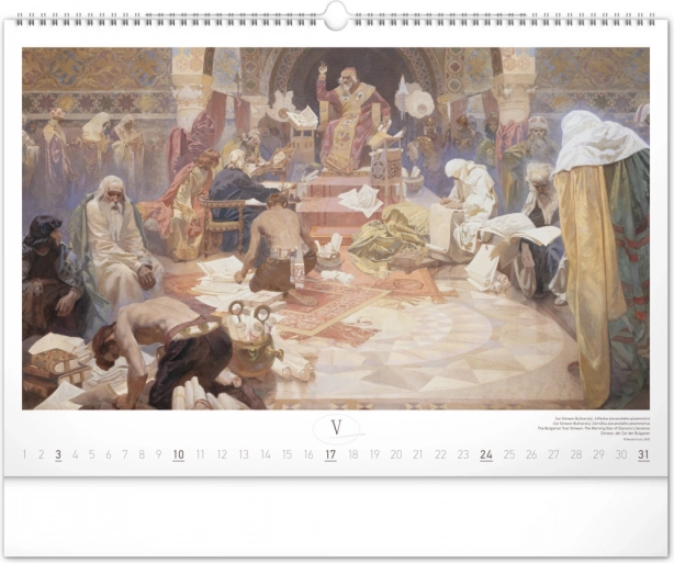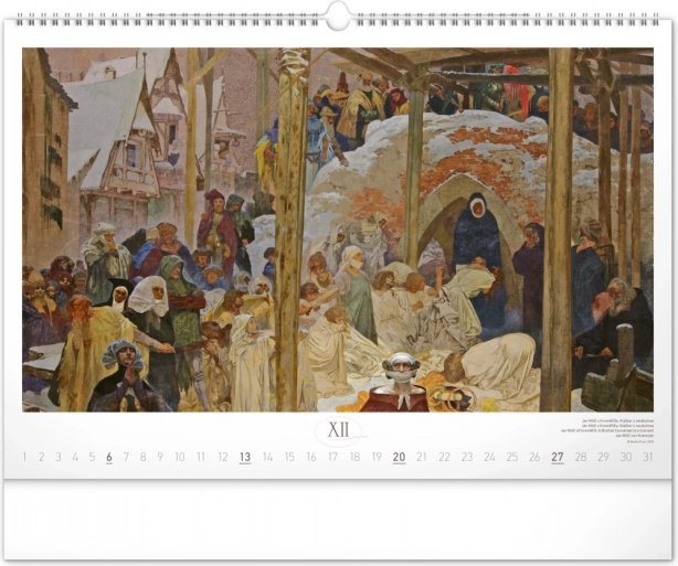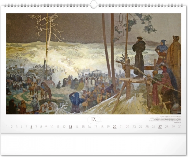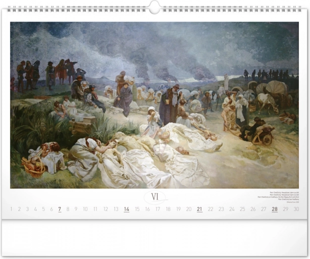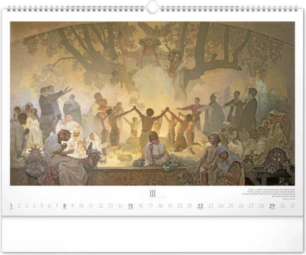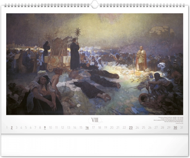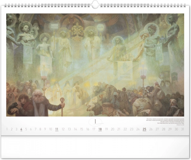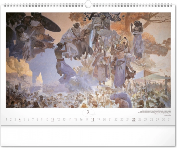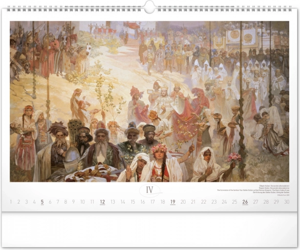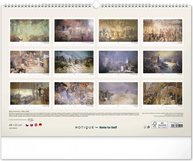 Calendrier mural avec des reproductions des chefs‑d’œuvre d’Alphonse Mucha de la série L’Épopée slave, idéal pour les amateurs d’art et d’histoire.