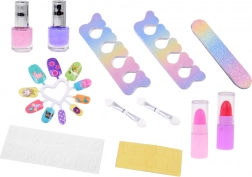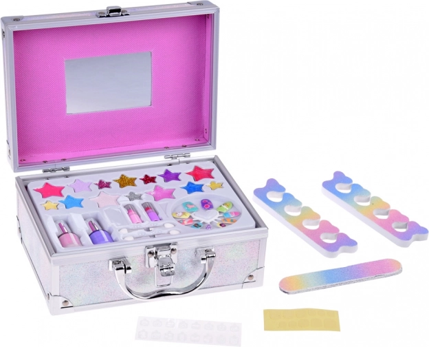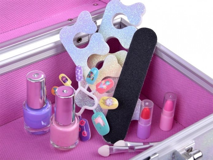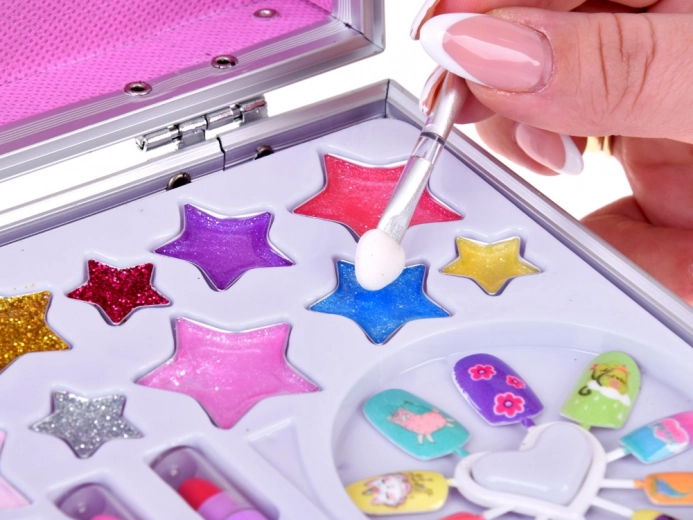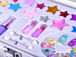 La valisette comprend tout le nécessaire pour un maquillage ludique : vernis à ongles, rouges à lèvres, fards à paupières, applicateurs, ongles autocollants et stickers. Pour un maquillage plus facile, un miroir est également intégré.