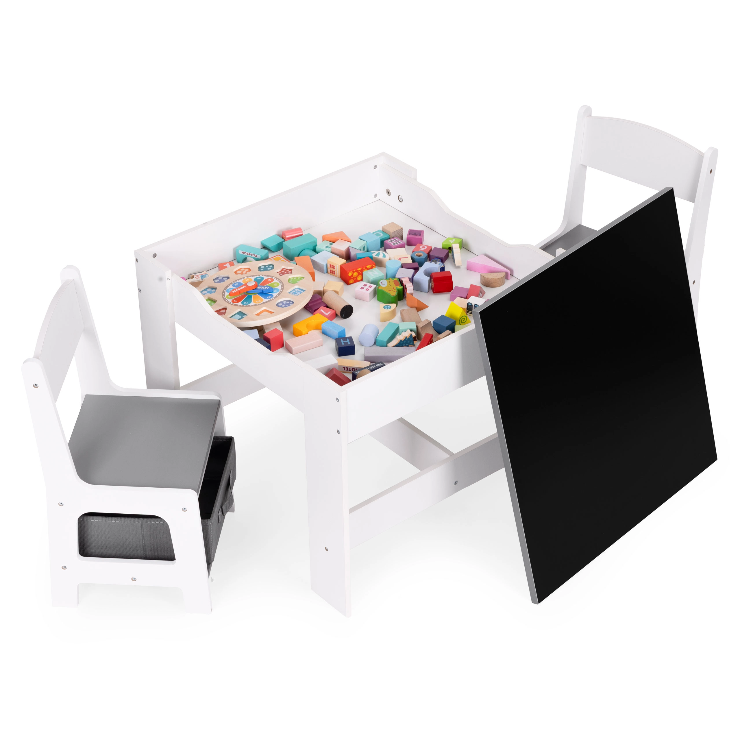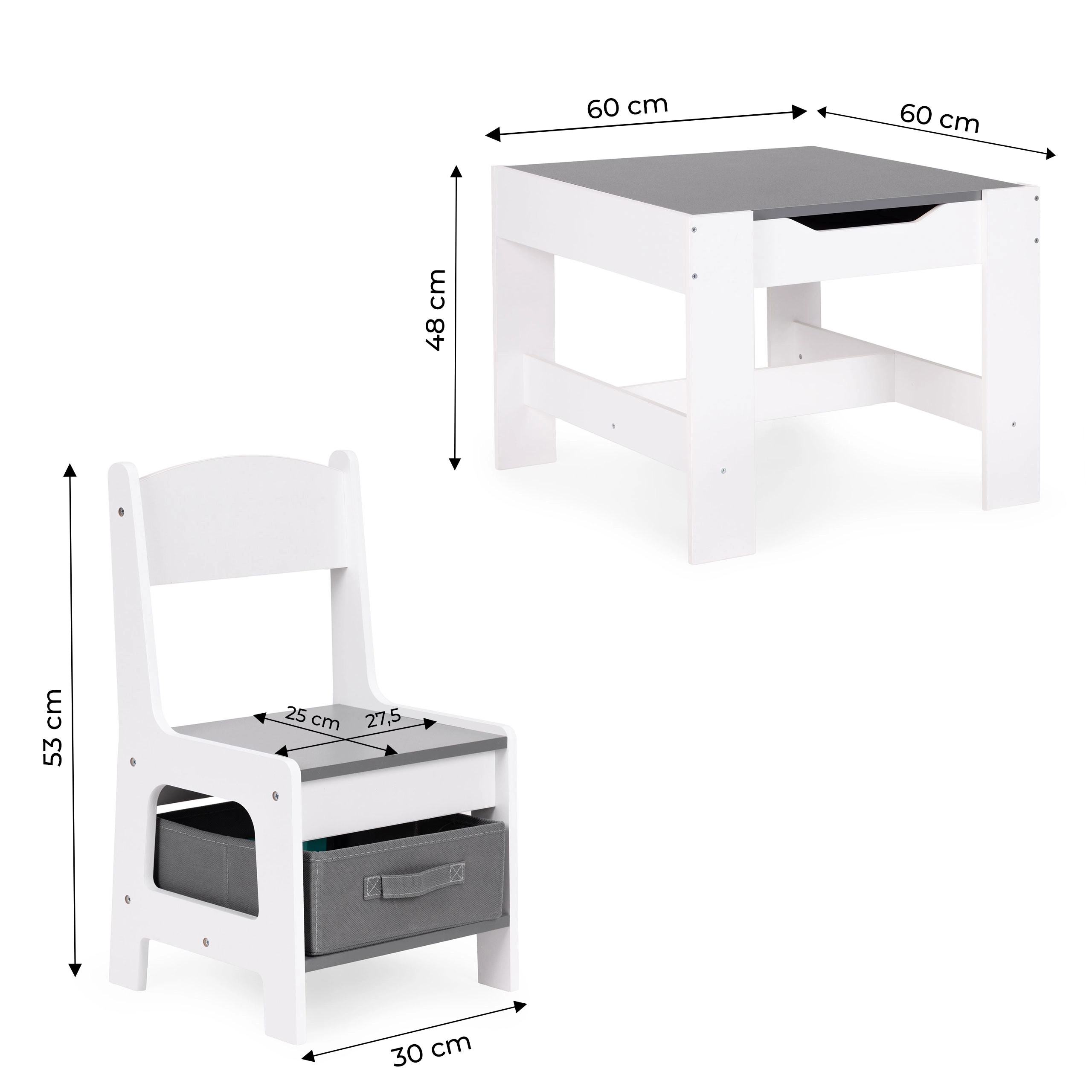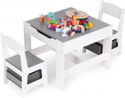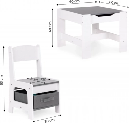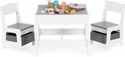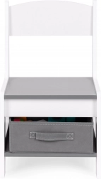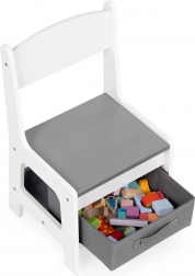 Un espace de rangement sous le plateau de la table offre de la place pour les jouets et accessoires. Les chaises sont dotées de tiroirs en tissu pratiques, qui gardent tout l’essentiel à portée de main. Grâce à un design astucieux, les enfants peuvent facilement organiser leur espace et apprendre à maintenir l’ordre.